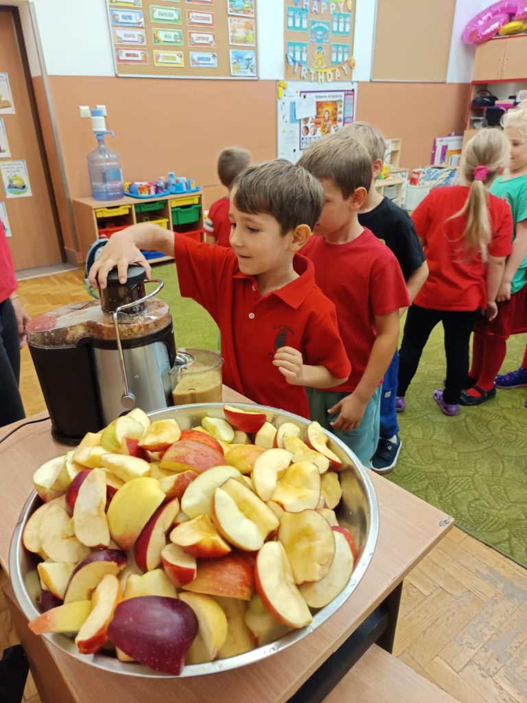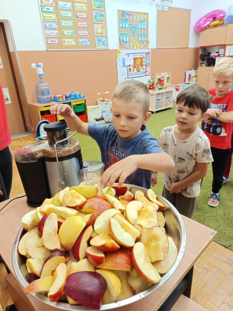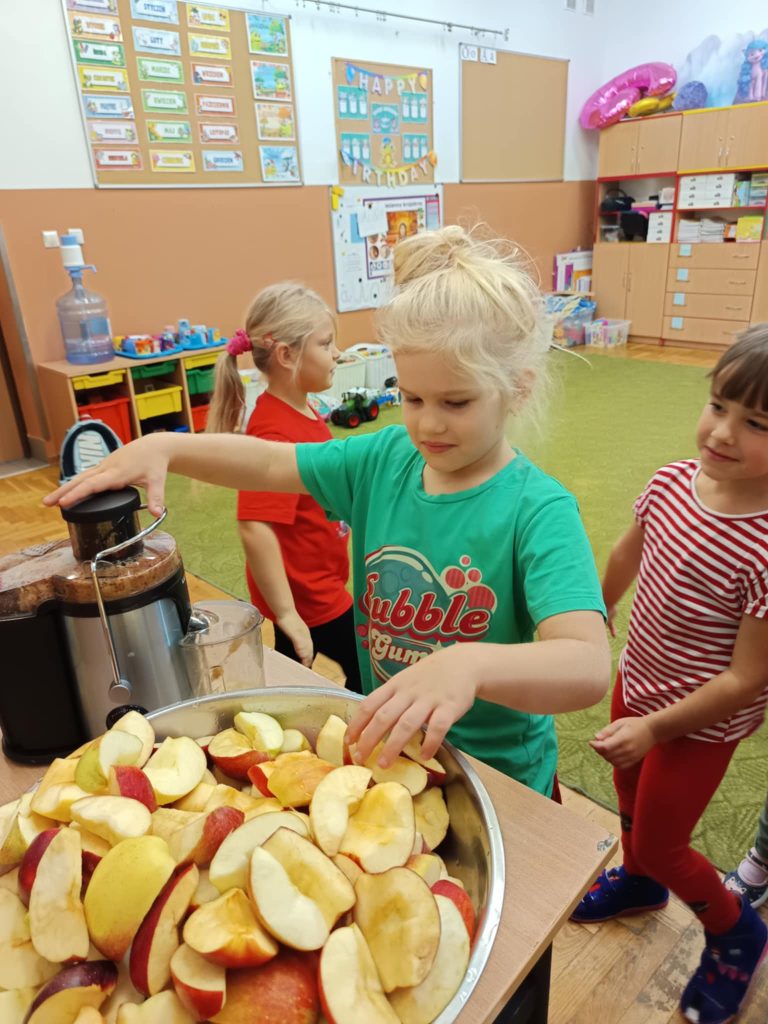 Największą atrakcją dnia było samodzielne przygotowanie soku jabłkowego. Podczas tego zadania dzieci miały okazję poznać działanie sokowirówki i dowiedzieć się do czego służy to urządzenie.