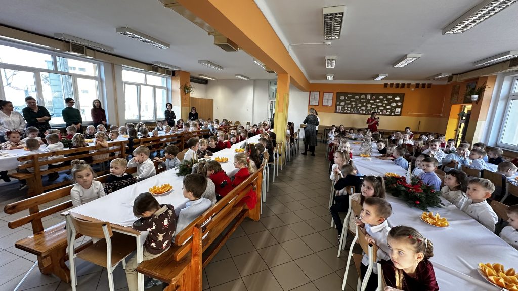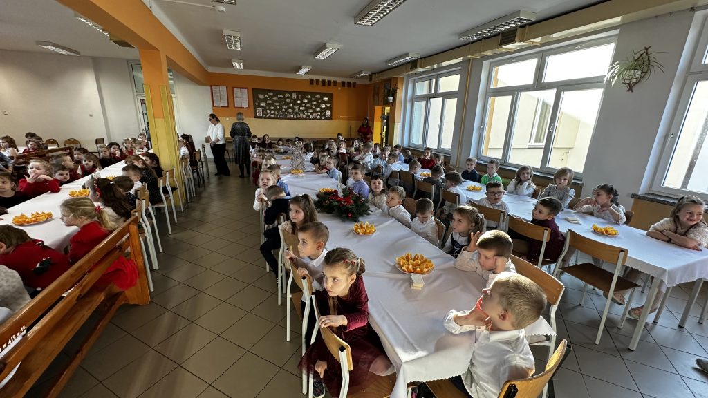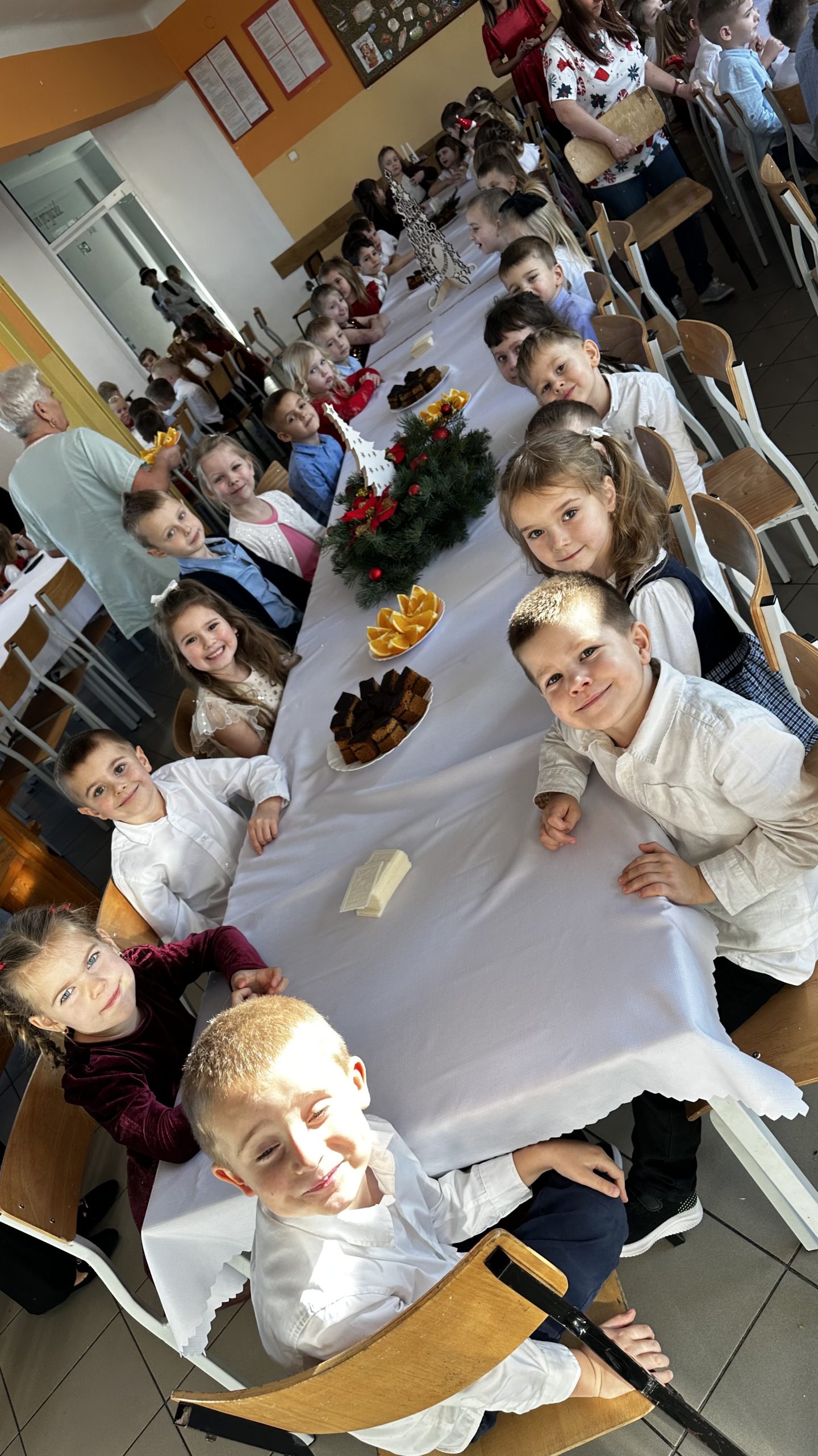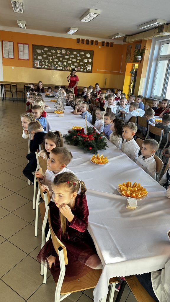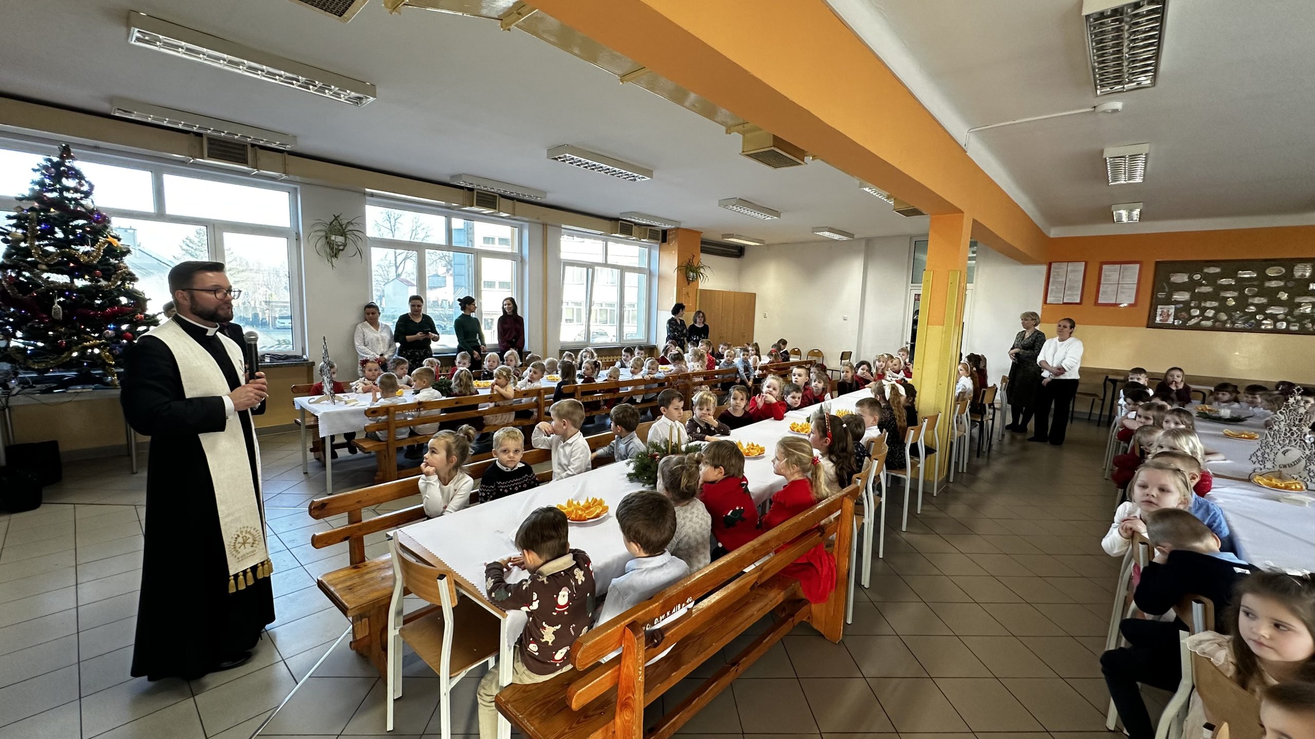 O wyznaczonej godzinie na pięknie udekorowanej stroikami jadalni zebrały się wszystkie dzieci, personel przedszkola. Pani Dyrektor mgr Marta Zięba, złożyła dzieciom i pracownikom najlepsze Bożonarodzeniowe życzenia. Wszyscy razem śpiewali kolędę wraz z ks. Marcinem Pikulem i podzielili się opłatkiem, a następnie wspólnie zjedli tradycyjne wigilijne potrawy.