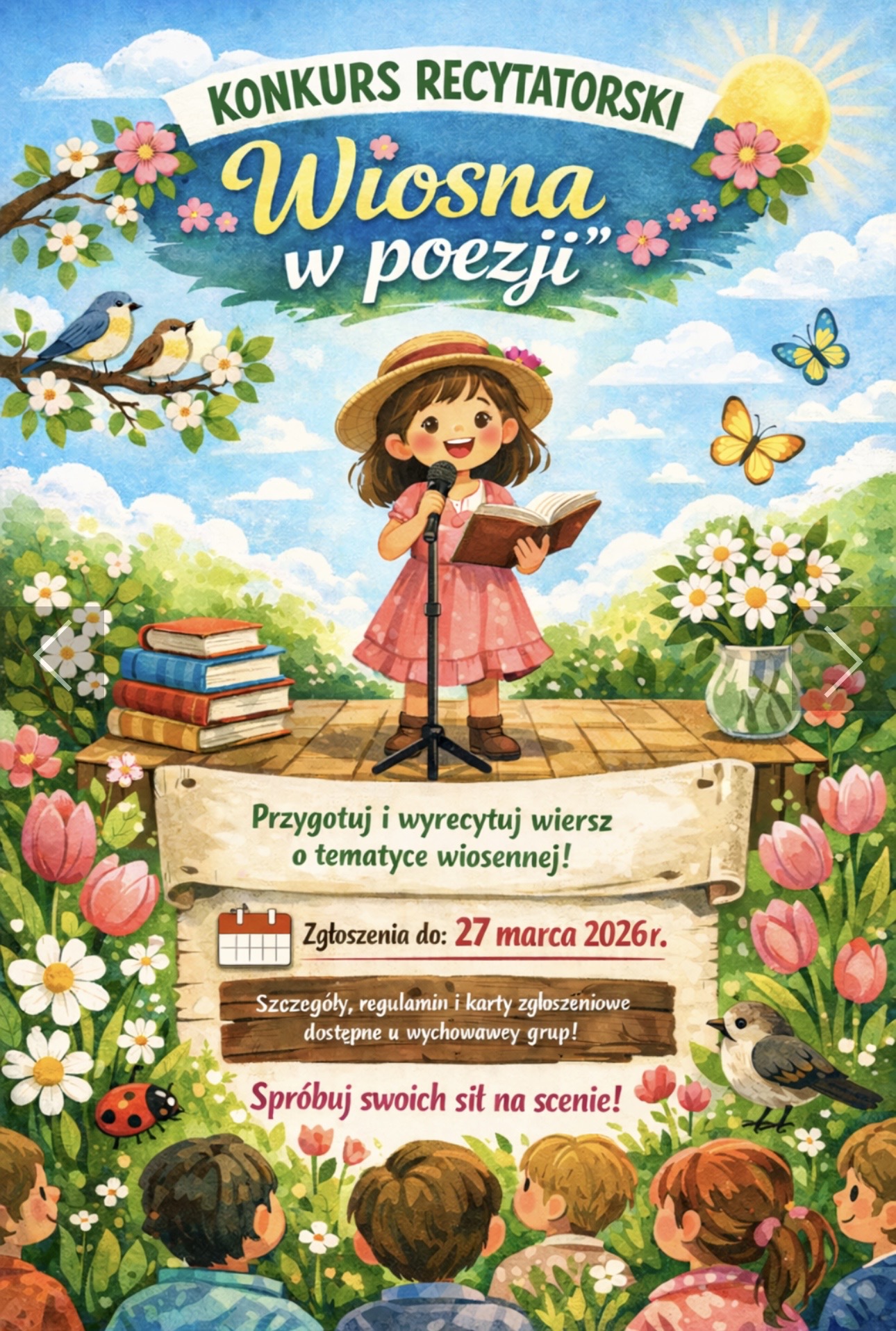 Zapraszamy do udziału w Konkursie recytatorskim „Wiosna w poezji” realizowanym w naszym przedszkolu w dwóch kategoriach wiekowych: 3-4-latki oraz 5-6 latki.