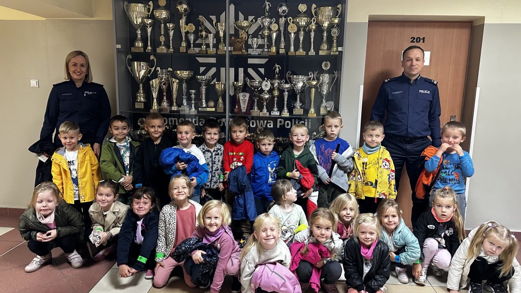 W poniedziałek 29.09.25 nasze 5-latki z grup „Rybki” i „Gwiazdki” wybrały się na wyjątkową wycieczkę. Pierwszym punktem programu była wizyta na posterunku policji w Mielcu. Dzieci mogły zobaczyć, jak wygląda praca policjantów, a także dowiedziały się, jak ważne jest dbanie o bezpieczeństwo. Ogromną niespodzianką okazało się spotkanie z Komendantem Policji Panem Pawłem Lesiem, który z radością przywitał dzieci i zrobił sobie z nimi pamiątkowe zdjęcia grupowe.
