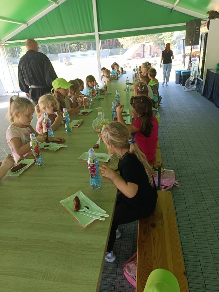 Po powrocie z leśnej gry była przerwa na smaczną kiełbaskę z grilla i herbatkę z sokiem malinowym.