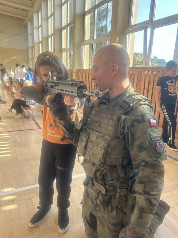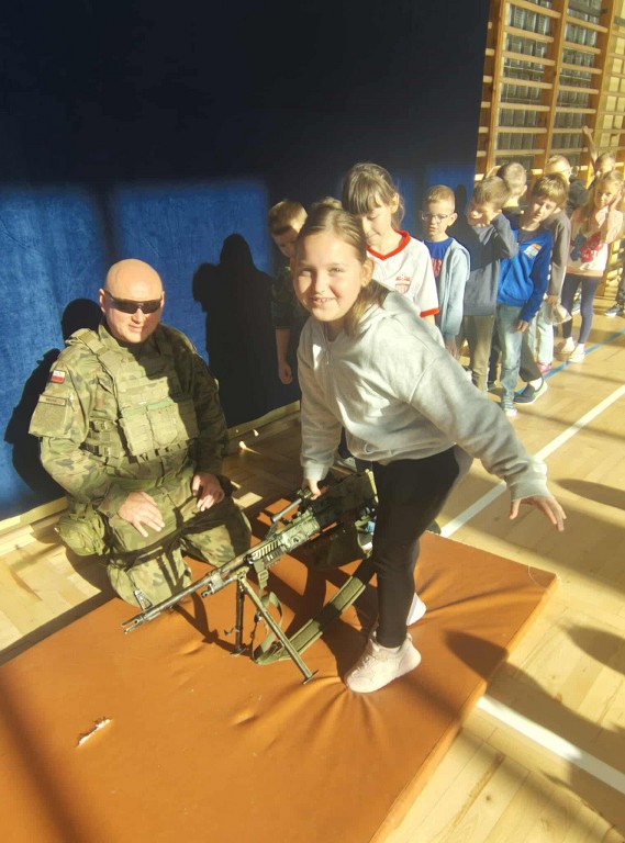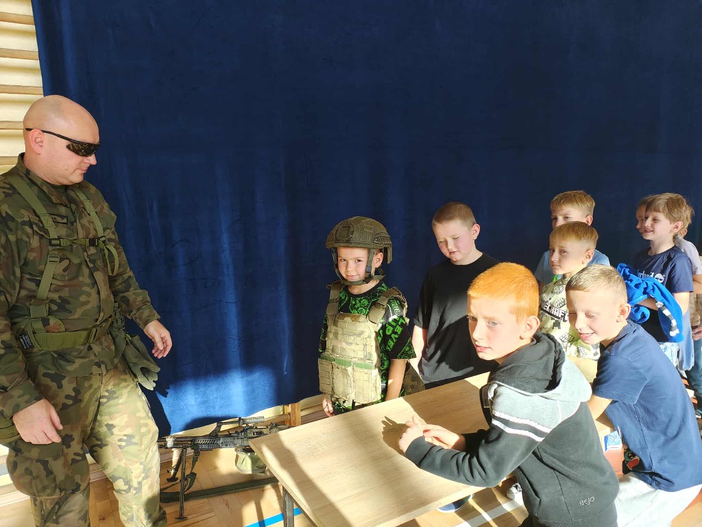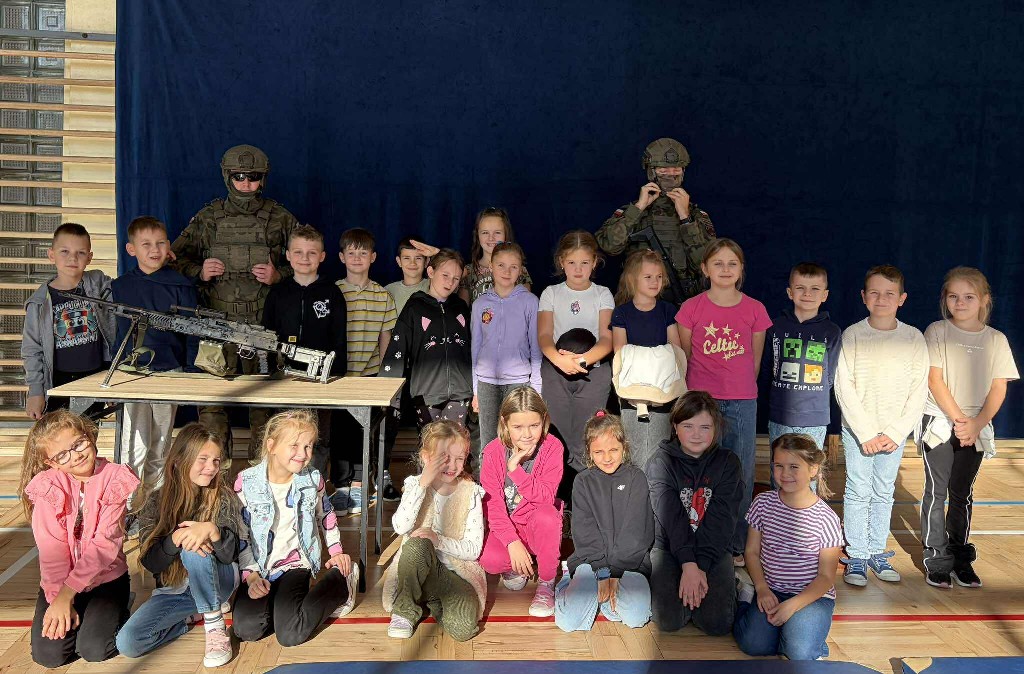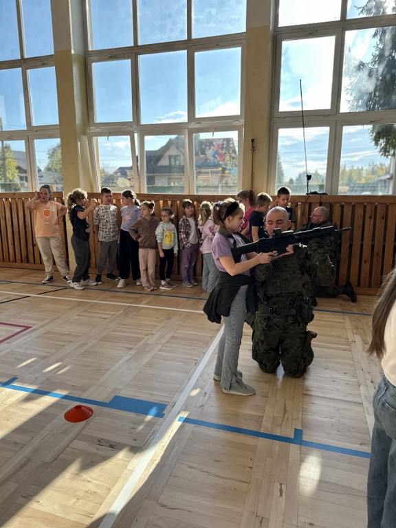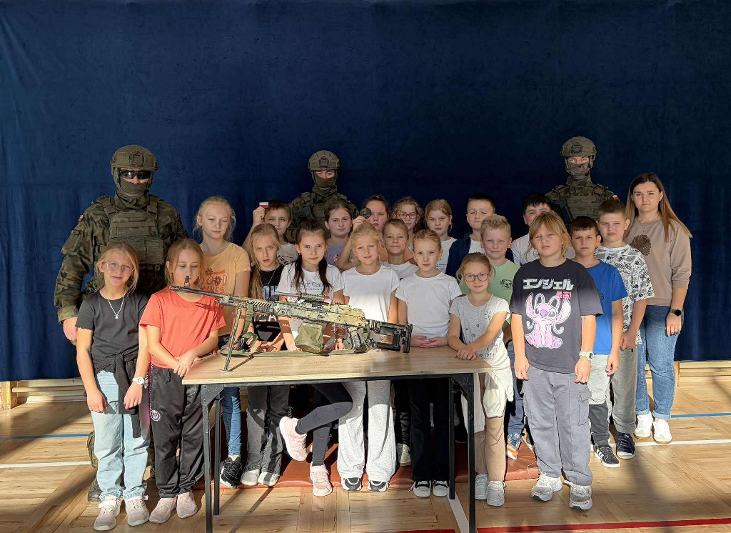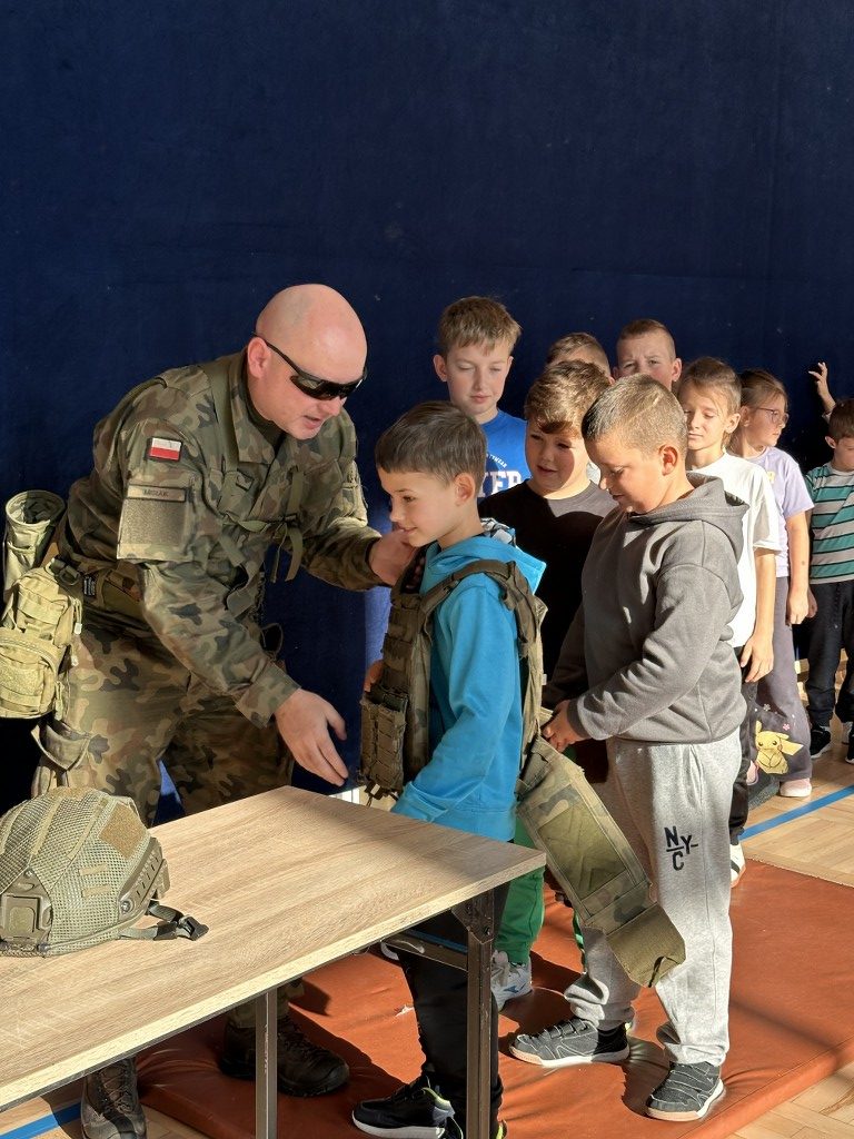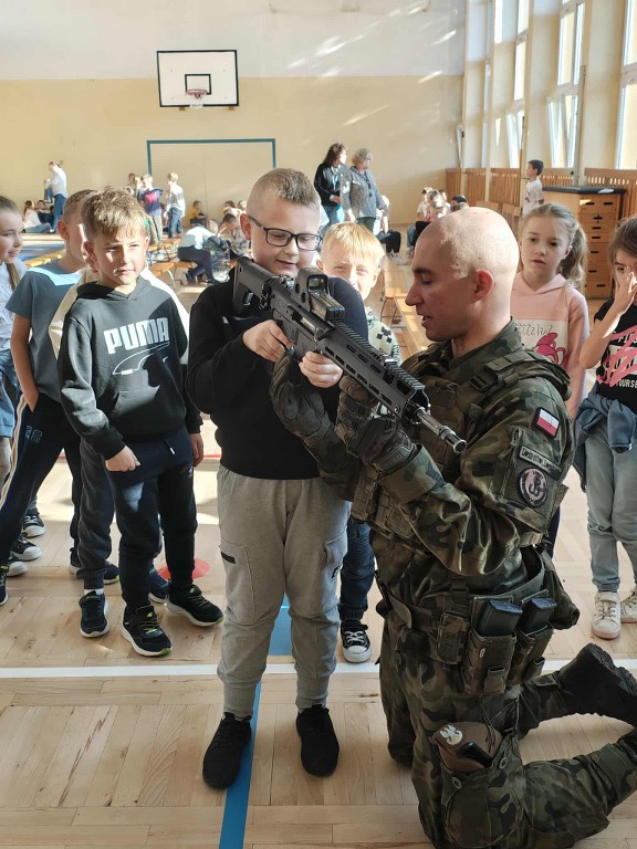 21 października uczniowie klas I–III spotkali się z żołnierzami 33. Batalionu Lekkiej Piechoty. Celem spotkania było przybliżenie uczniom pracy żołnierza oraz zapoznanie ich ze sprzętem wojskowym. Podczas spotkania żołnierze opowiedzieli o swojej służbie, zadaniach realizowanych przez Wojska Obrony Terytorialnej oraz o tym, jak wygląda ich codzienna praca. Uczniowie mogli obejrzeć z bliska sprzęt i umundurowanie wojskowe, przymierzyć hełmy i kamizelki taktyczne, sprawdzić, ile waży broń, czołgać po wyznaczonej trasie i zobaczyć, jak wygląda świat w ciemności przez noktowizory. Dziękujemy za spotkanie.