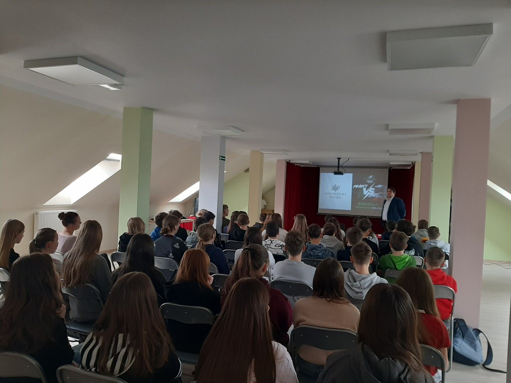 16 października 2025r. uczniowie klas 7 i 8 brali udział w IV edycji akcji „Adwokaci rozjaśniają prawo”, której tegoroczny temat przewodni brzmiał: „Prawo vs. hejt. Szkoła wolna od hejtu”. W jej ramach nasi uczniowie spotkali się z adwokatem dr Karolem Fliskiem, który mówił m.in. o tym czym różni sie krytyka od hejtu, jakie konsekwencje niesie za sobą hejt w sieci i w realnym świecie, jak prawo chroni uczniów przed mową nienawiści, kiedy słowa mogą stać się przestępstwem, jak reagować na hejt i gdzie szukać pomocy oraz jaką jest odpowiedzialność prawna nieletnich za hejt i inne zachowani naruszające prawo.