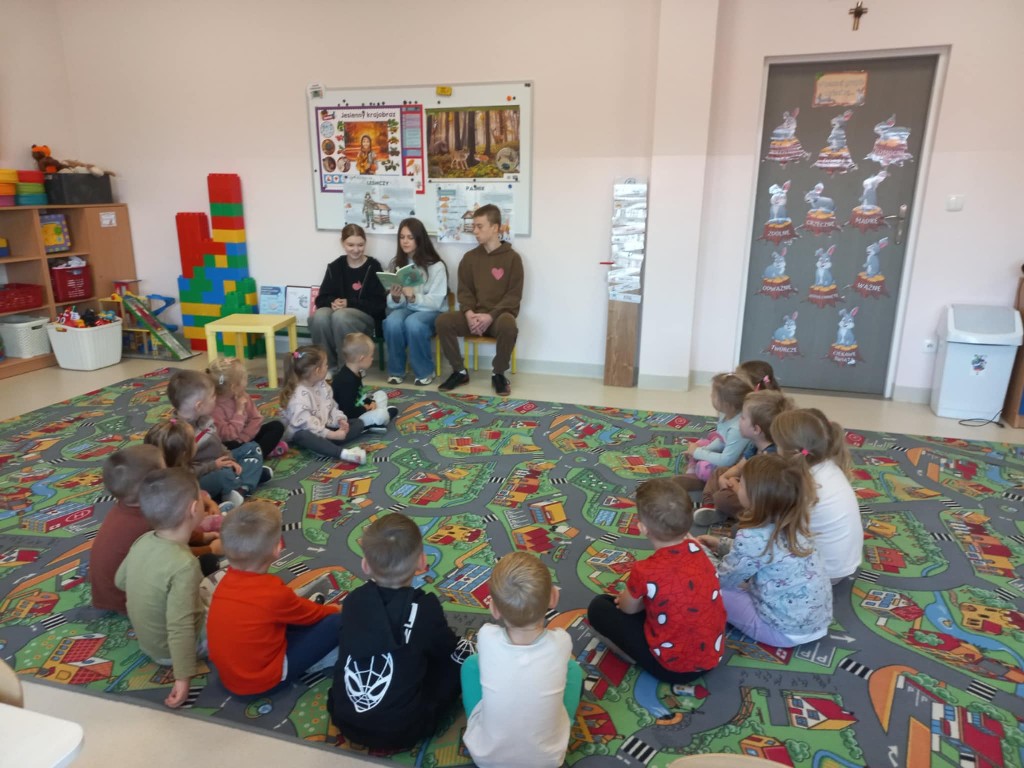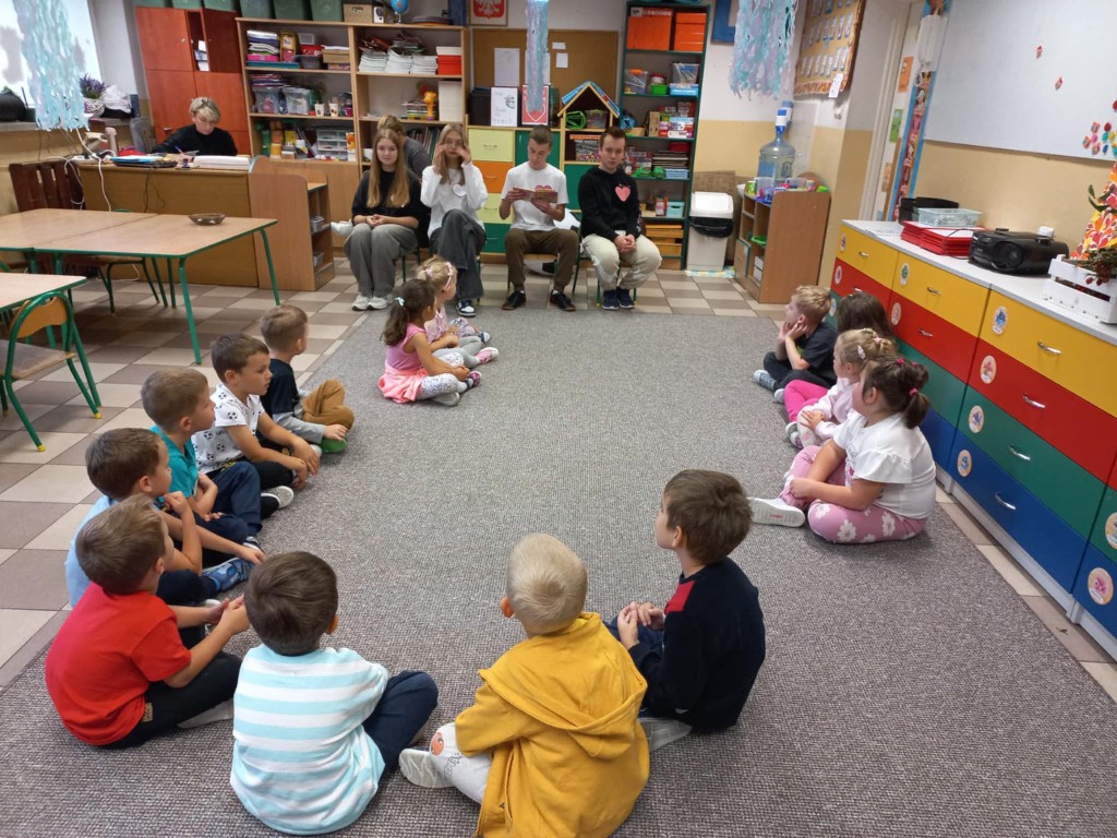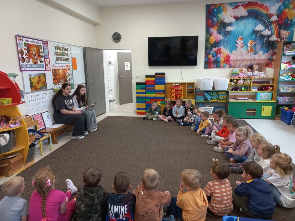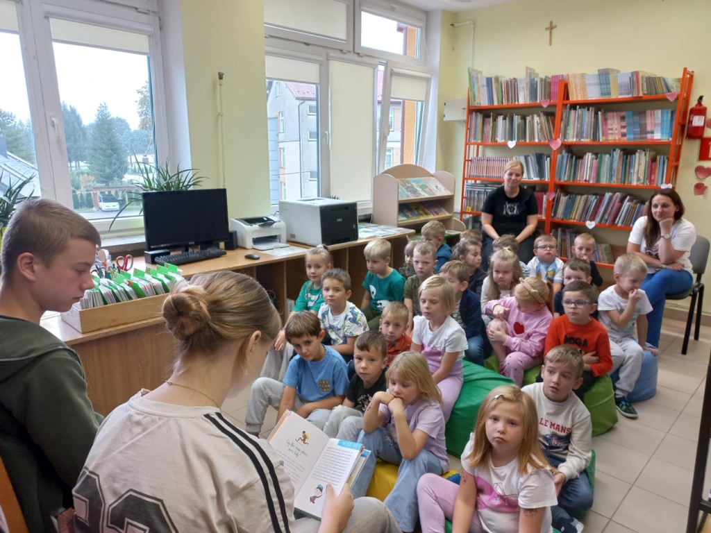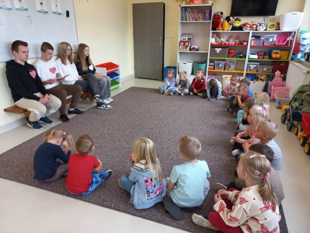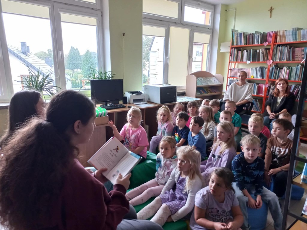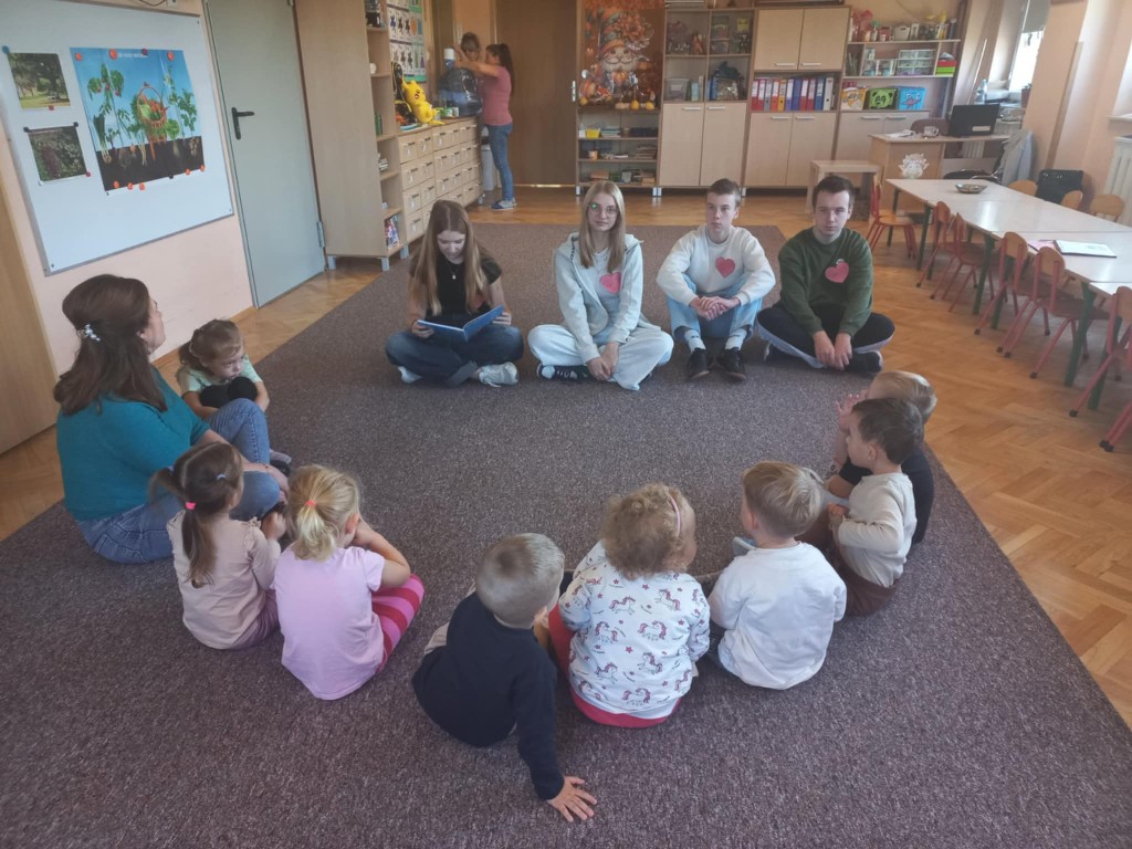 W dniach 1 i 7 października na spotkaniach czytelniczych w bibliotece szkolnej były obecne również dzieci z zerówek, z grup Żabki i Misie. Przedszkolaki odsłuchały utwór Anety Grabowskiej ,,Przedszkole Pani Matyldy. Zosia i złote serce”, czytany przez uczniów klasy 8a i 8b. Poznały znaczenie wyrażeń frazeologicznych – złote serce oraz kraść z kimś konie.