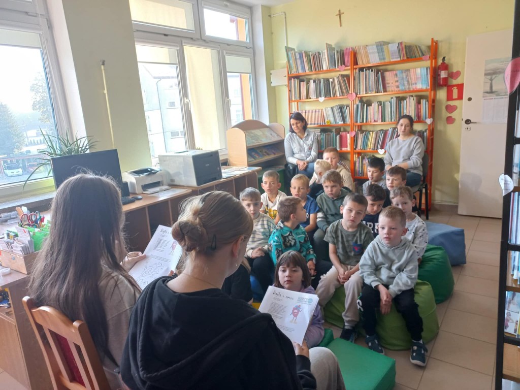 W dniach 1, 7 i 8 października w bibliotece szkolnej odbyły się lekcje biblioteczne dla klas 1 w ramach akcji „Czytamy z Sercem”. Najpierw pierwszoklasiści zostali zapoznani z ideą akcji. Następnie uczniowie klasy 8a i 8b odczytali swoim młodszym kolegom i koleżankom ,,Bajkę o sercu” Michała Filipka oraz ,,Alfabet zdrowego stylu życia”. Uczniowie chętnie zabierali głos podczas dyskusji na temat zdrowego odżywiania, aktywności fizycznej oraz zalet czytania. Na zakończenie otrzymali zadanie obserwowania swoich nawyków żywieniowych przez najbliższy miesiąc oraz zapisywania wyników w tabelce. Atmosfera podczas zajęć była przyjazna.