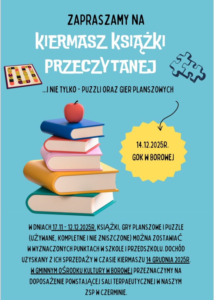 Ogłaszamy zbiórkę książek przeczytanych – dla młodszych i starszych, gier planszowych i puzzli (używanych,kompletnych, nie zniszczonych) – 14 grudnia 2025r.(niedziela) bierzemy bierzemy udział w Kiermaszu Książki Przeczytanej organizowanej przez GOK w Borowej – dochód uzyskany ze sprzedaży w/w rzeczy przeznaczymy na doposażenie powstającej w naszym ZSP w Czerminie Sali Terapeutycznej, w której odbywają się zajęcia dodatkowe dla dzieci z przedszkola i szkoły podstawowej.