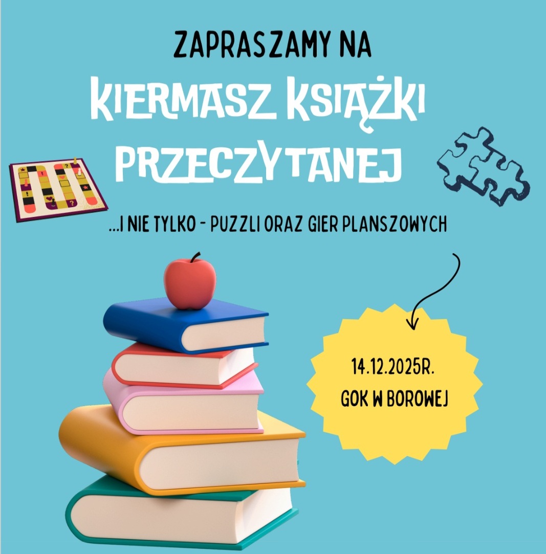 Ogłaszamy zbiórkę książek przeczytanych – dla młodszych i starszych, gier planszowych i puzzli (używanych,kompletnych, nie zniszczonych) – 14 grudnia 2025r.(niedziela) bierzemy bierzemy udział w Kiermaszu Książki Przeczytanej organizowanej przez GOK w Borowej – dochód uzyskany ze sprzedaży w/w rzeczy przeznaczymy na doposażenie powstającej w naszym ZSP w Czerminie Sali Terapeutycznej, w której odbywają się zajęcia dodatkowe dla dzieci z przedszkola i szkoły podstawowej.