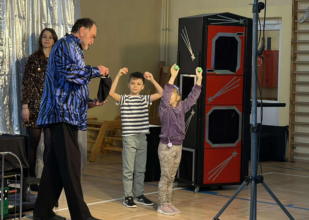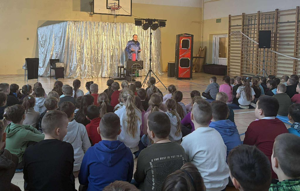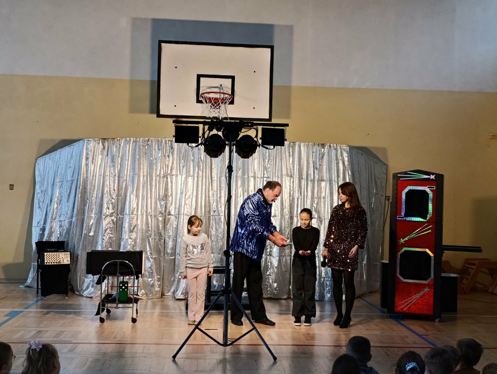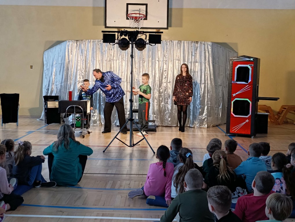 Szczególną atrakcją było aktywne uczestnictwo dzieci w pokazie. Uczniowie chętnie zgłaszali się do asystowania iluzjoniście, dzięki czemu mogli poczuć się częścią magicznego spektaklu. Dzieci miały także możliwość obserwowania wykonywanych sztuczek z bardzo bliska, co sprawiło, że magia wydawała się jeszcze bardziej tajemnicza i fascynująca. Bezpośredni kontakt z artystą oraz jego poczucie humoru stworzyły przyjazną, radosną atmosferę, sprzyjającą wspólnej zabawie.