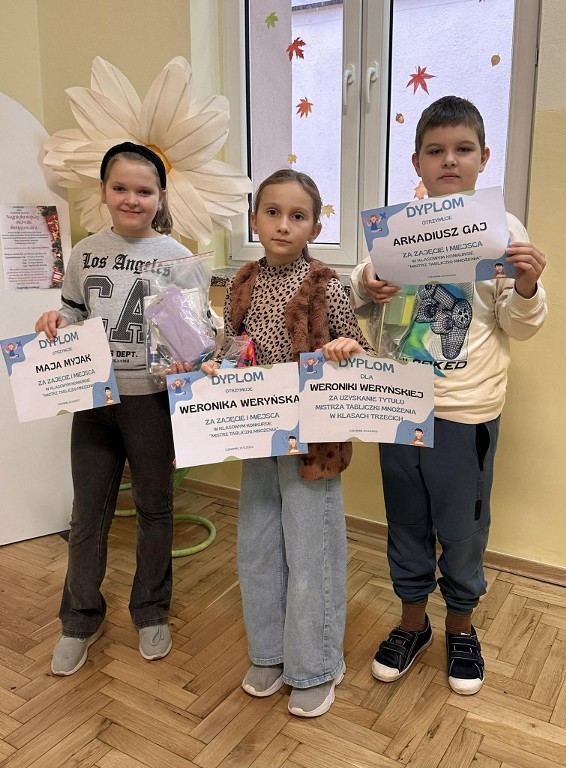 W klasach trzecich świętowano „Światowy Dzień Tabliczki Mnożenia”, który obchodzimy 21 listopada. Uczniowie powtarzali i utrwalali znajomość tabliczki poprzez m.in.: gry planszowe, zabawy stolikowe, ćwiczenia na platformie matzoo.pl. Następnie wzięli udział w „Mistrzostwach Tabliczki Mnożenia Klas Trzecich”. Zadaniem uczniów było rozwiązanie jak największej ilości przykładów w ciągu jednej minuty. Wyłoniono klasowych Mistrzów: