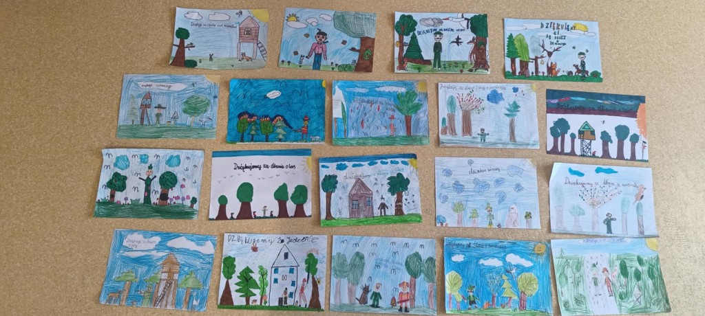 Akcja Strażnicy Lasów – Laurka dla Strażników Lasów to wyjątkowa inicjatywa, której celem jest podziękowanie strażakom i leśnikom za ich trud w ochronie lasów przed pożarami. Uczniowie klas I-III naszej szkoły również wzięli udział IV edycji tej akcji. Dzieci z całej Polski stworzyły GIGA Laurkę, składającą się z 43 084 kolorowych prac! W przedsięwzięciu uczestniczyło 48 307 dzieci z 2 999 placówek edukacyjnych.