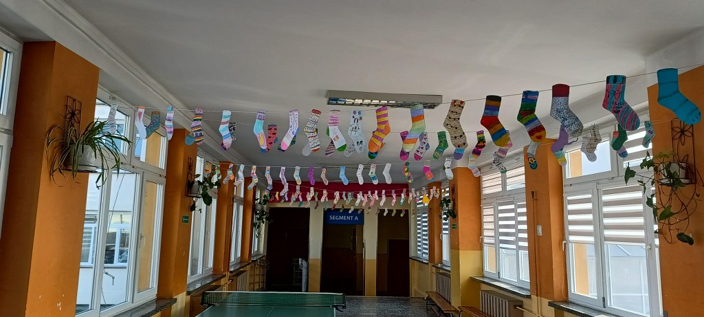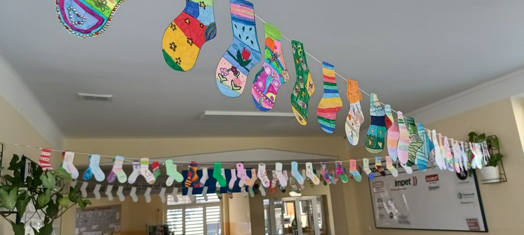 W ramach akcji nasza szkoła została ozdobiona kolorowymi, różnorodnymi skarpetkami, tworząc radosną i pełną empatii atmosferę. Była to nie tylko forma kreatywnej zabawy, ale przede wszystkim ważna lekcja wrażliwości, akceptacji i zrozumienia.