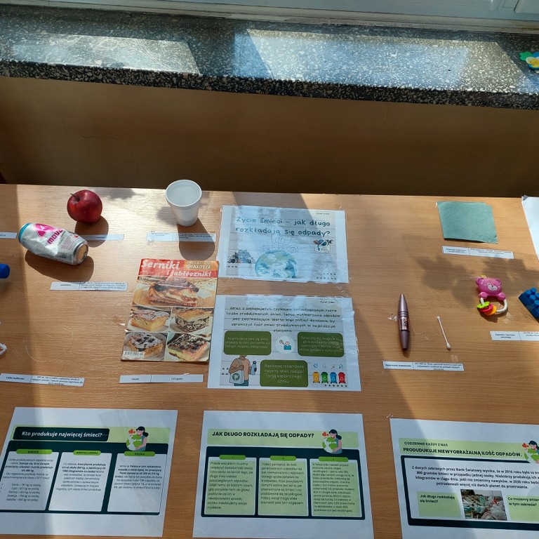 Uczniowie należący do kółka chemiczno – ekologicznego stworzyli wystawę pt. “Życie śmieci – jak długo rozkładają się odpady?” w celu zwrócenia uwagi, jak wraz z rozwojem technologii rośnie liczba produkowanych śmieci. Dzięki wystawie mogliśmy dowiedzieć się w jakim czasie rozkładają się różne odpady oraz co my możemy zrobić aby tę liczbę odpadów zmniejszyć.