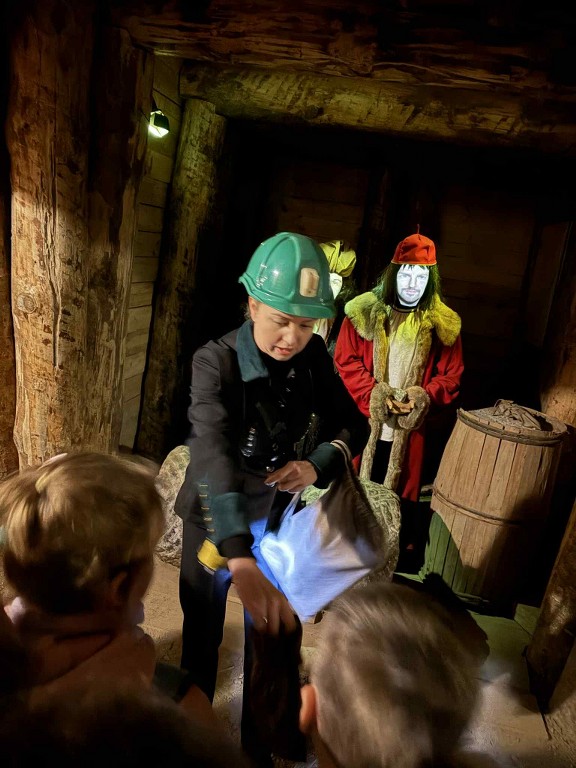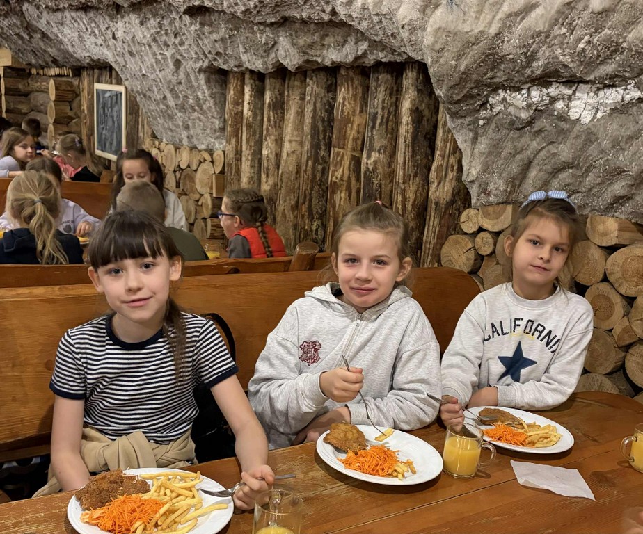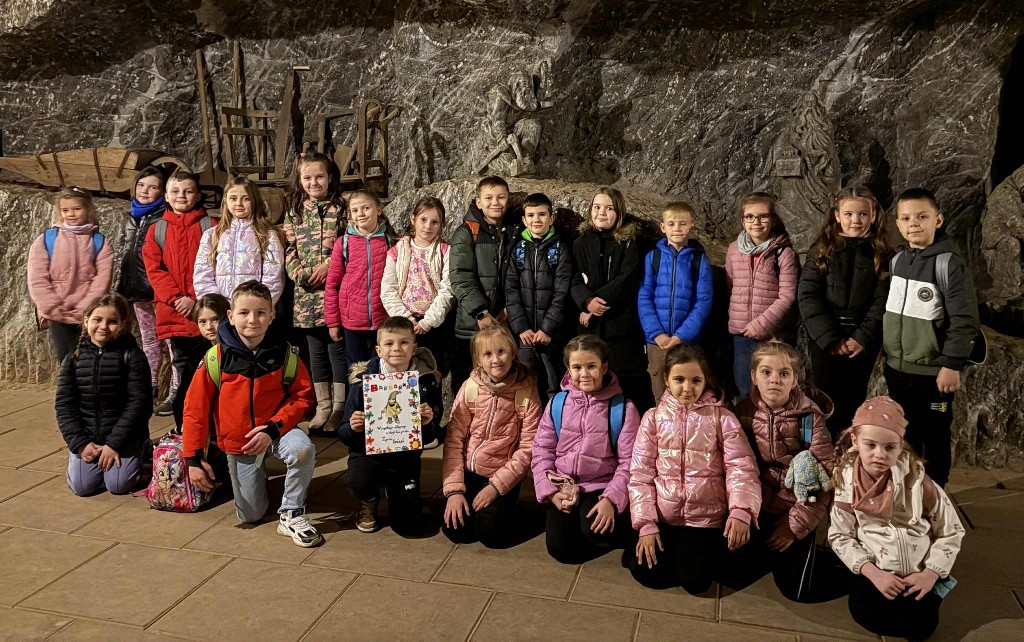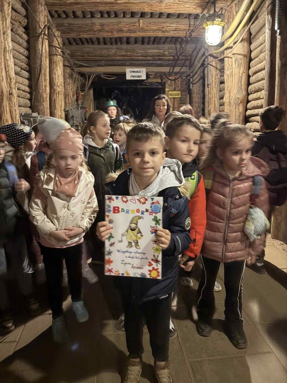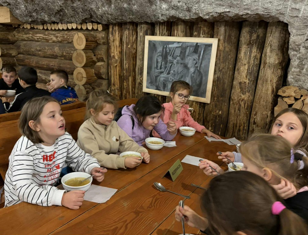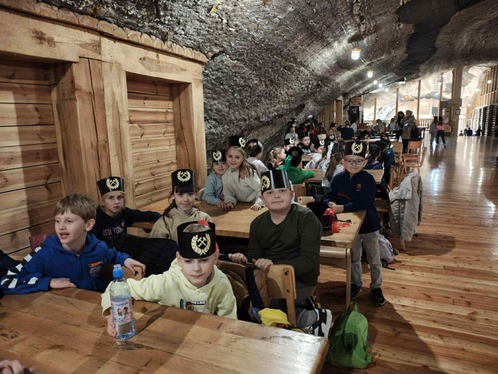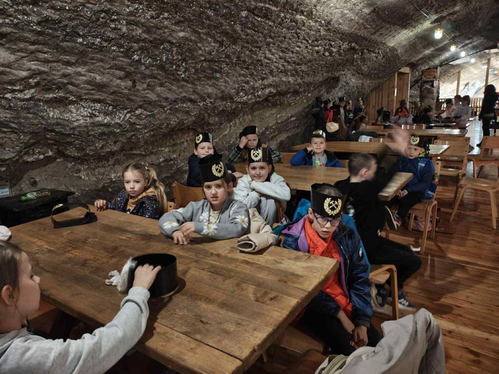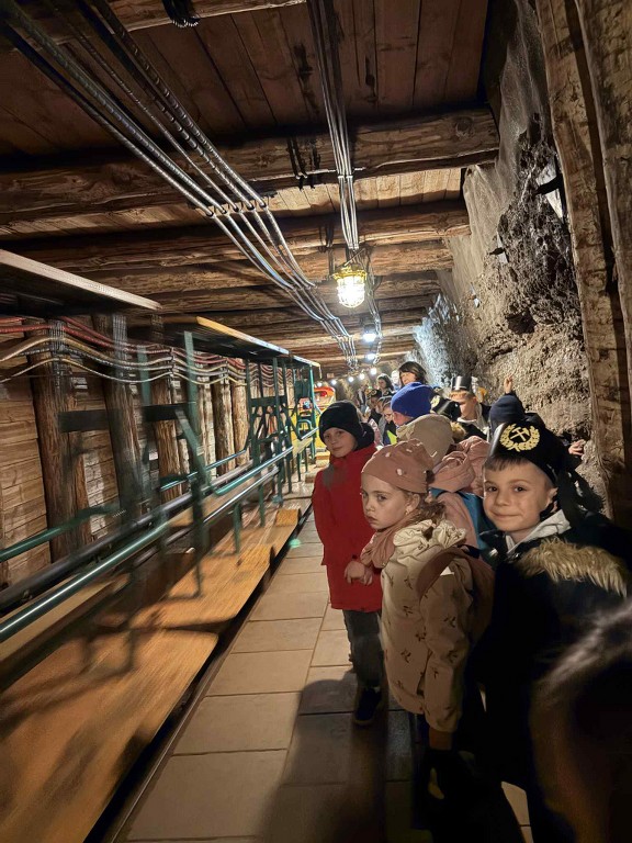 Zwiedzanie rozpoczęto od zjazdu do kopalni szybem Cambi. Już sam zjazd był dla dzieci wielkim przeżyciem. W labiryncie podziemnych, solnych korytarzy czekało na wycieczkowiczów wiele niespodzianek. Pod czujnym okiem przewodników dzieci zwiedzały kopalnię oraz odbyły warsztaty plastyczne „Śladami pracy górnika”. Za pomocą holograficznych i interaktywnych inscenizacji oraz słuchowisk przekazana została wiedza o historii kopalni, średniowiecznych technikach wydobywczych, pracy górnika, zwyczajach górniczych oraz codziennym życiu w kopalni. W pamięci dzieci na pewno pozostaną prezentacje pokazujące dawny system wentylacji, pracę wypalaczy metanu, pożary oraz zalanie wodą podziemnych chodników. Na dzieci czekało wiele atrakcji: przejażdżka kolejką, zwiedzanie kaplicy św. Kingi, spotkanie z górnikiem w galowym stroju. Trasę wycieczkową zakończono wspólnym spędzeniem czasu, przy smacznym obiedzie, w największej z podziemnych komór – Komorze Ważyn, znajdującej się ok. 250 metrów pod powierzchnią ziemi. Dodatkowo w wolnym czasie dzieci zagrały w piłkarzyki i zrobiły zakupy w magicznym, solnym sklepiku. Poznawanie „podziemnego, solnego miasta” było niezwykłą przygodą oraz interesującą lekcją historii i przyrody. Dzięki tej wycieczce dzieci doceniły ciężką i bardzo niebezpieczną pracę górników. Za wzorowe zachowanie w czasie zwiedzania otrzymaliśmy od pani przewodnik pokaźną bryłkę soli, która będzie pamiątką po tej ciekawej wycieczce. Dzieci powróciły zmęczone, ale bardzo zadowolone, z samodzielnie wykonaną na warsztatach plastycznych czapką górniczą, solnymi pamiątkami i niezapomnianymi wspomnieniami.