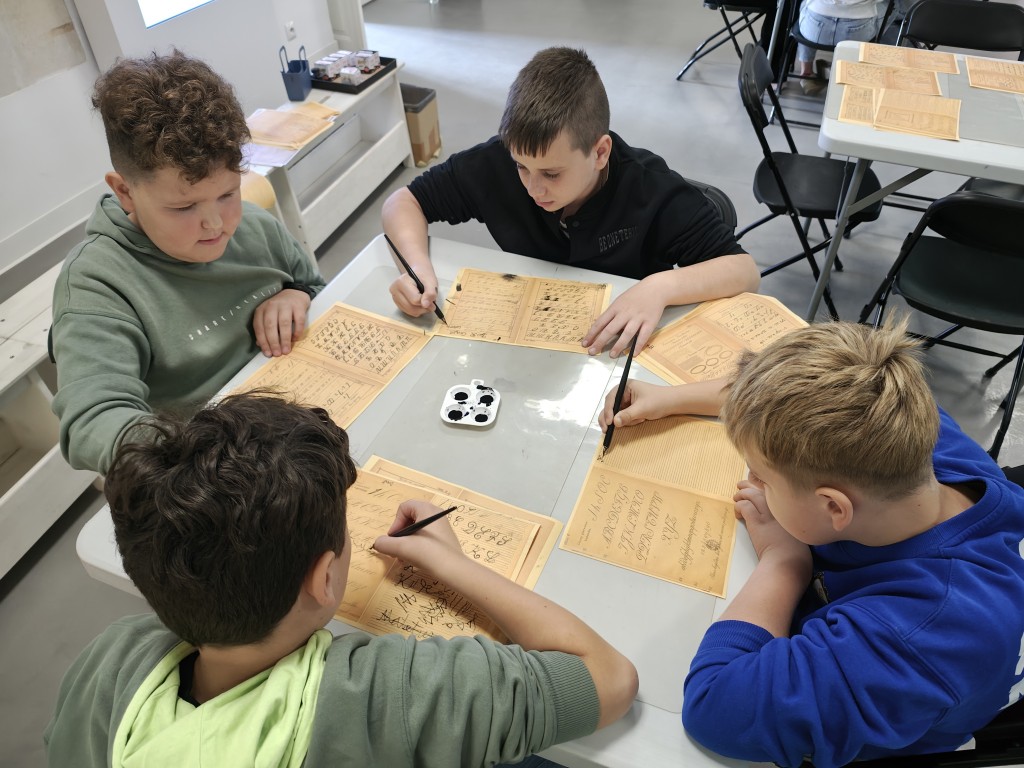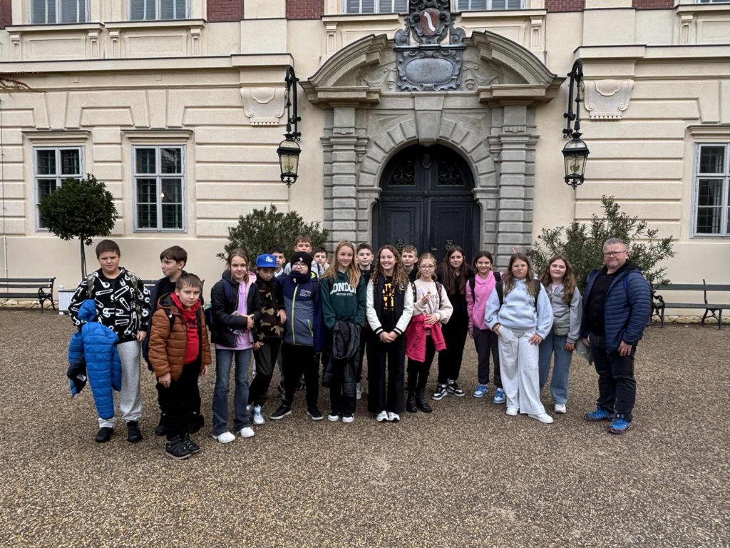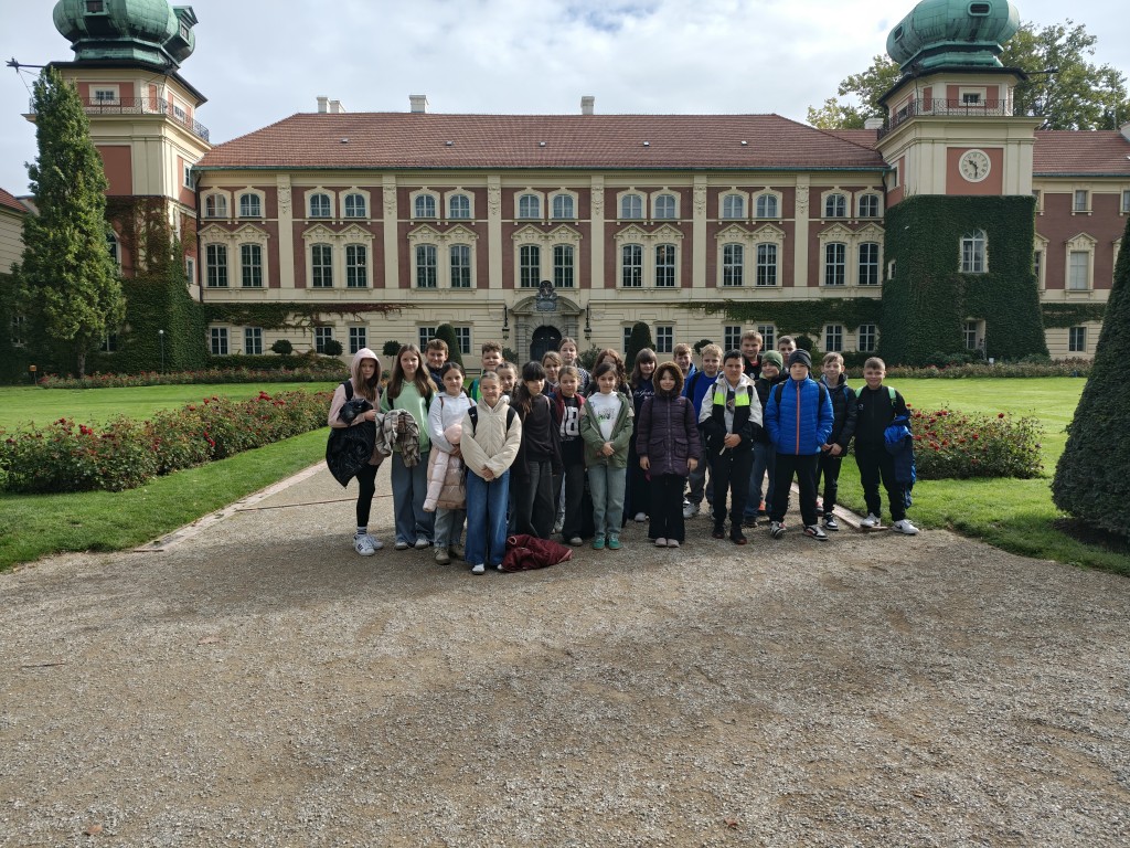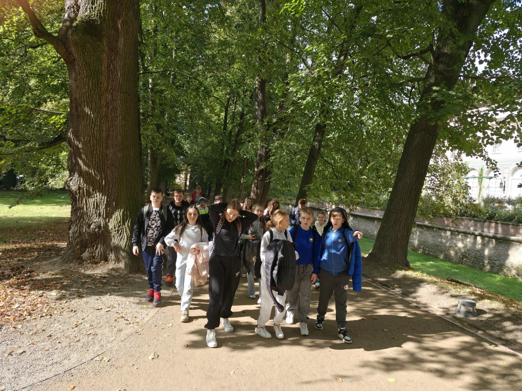 7 października 2025 roku klasy 5A i 5B wraz z wychowawcami i opiekunami brały udział w wycieczce edukacyjno-krajoznawczo-historycznej do Muzeum-Zamku w Łańcucie. W Centrum Edukacji Tradycji im. Jana Potockiego, (dawna Oranżeria) uczniowie uczestniczyli w warsztatach pt.” Piórem i atramentem: Sztuka pięknego pisania”, gdzie odkrywaliśmy dawną sztukę kaligrafii. Dowiedzieliśmy się, jak dawniej pisano i poznaliśmy historię narzędzi pisarskich, a następnie spróbowaliśmy swoich sił w tej eleganckiej sztuce. Pisaliśmy piórem ze stalówką maczaną w czarnym atramencie. Oj, ręce były bardzo brudne!