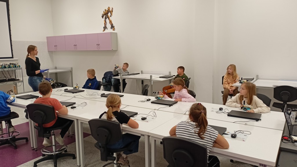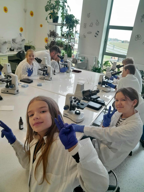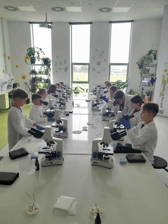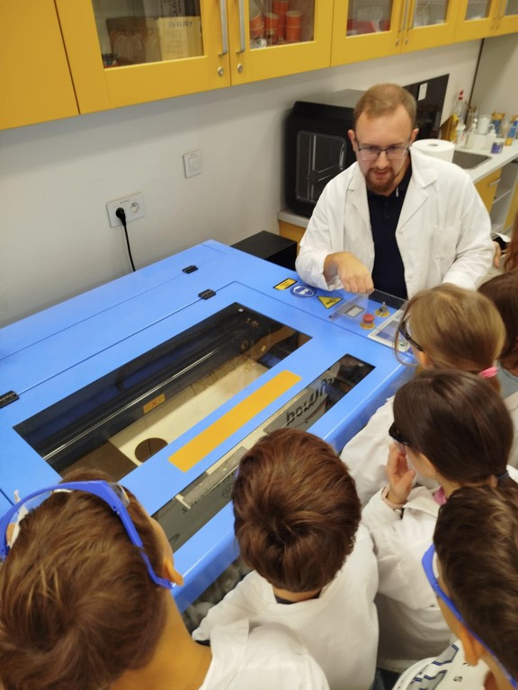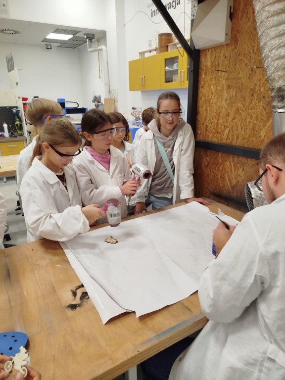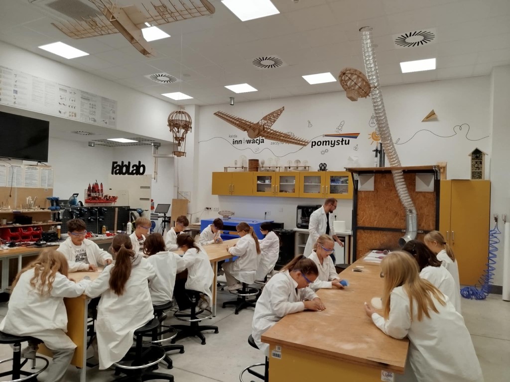 Wizyta rozpoczęła się od zajęć warsztatowych z robotyki, biologii, Fablab, podczas których uczniowie w sposób praktyczny poznawali tajniki z poszczególnych dziedzin nauki: programowali roboty, własnoręcznie wykonywali zawieszki, obserwowali świat pod mikroskopem.