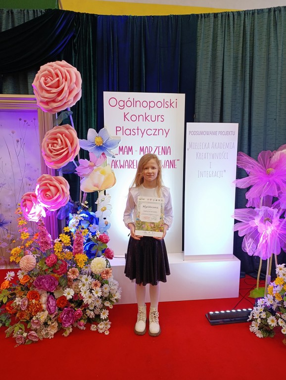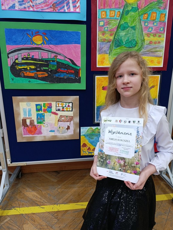 Wśród nagrodzonych znalazła się Amelia Kokoszka – uczennica  naszej szkoły z klasy IV„a”, która otrzymała wyróżnienie za swoją twórczą i pełną wyobraźni pracę. Udział w konkursie jest pięknym dowodem na to, że talent, pasja i wyobraźnia potrafią zachwycić innych. Praca Amelii pokazała, jak niezwykłe mogą być marzenia, gdy zostaną przeniesione na papier z taką wrażliwością i lekkością. Podziękowania skierowano również do opiekunów artystycznych, za zaangażowanie i wsparcie udzielone w przygotowaniach do konkursu. Uroczystość uświetniła obecność Krystyny Skowrońskiej, posłanki na Sejm RP, która podkreśliła znaczenie rozwijania pasji i talentów wśród młodzieży oraz rolę sztuki