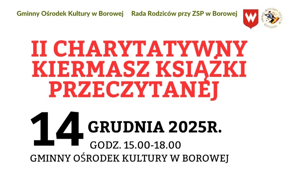 14 grudnia 2025r. (niedziela) nasz Zespół Szkolno – Przedszkolny w Czerminie bierze udział w II Charytatywnym Kiermaszu Książki Przeczytanej w Gminnym Ośrodku Kultury w Borowej (w godzinach 15.00-18.00). Spotkają nas Państwo na naszym stoisku gdzie będziemy oferować do zakupu ciekawe książki dla każdej kategorii wiekowej, puzzle oraz gry planszowe. Nasi uczniowie będą umilać czas występami wokalnymi.